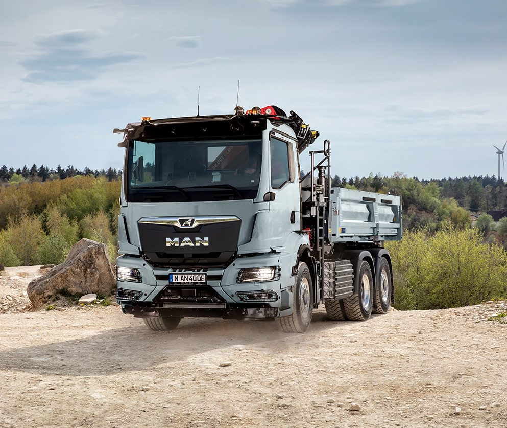 Zaprezentowany na targach Bauma elektryczny trzyosiowy MAN eTGS 28.449 6×2-4 został wyposażony w wywrotkę trójstronną Meiller Trigenius D316 oraz żuraw Palfinger PK 24.001 SLD 5. Dzięki modułowej koncepcji napędu, w podwoziu bez problemu stworzono przestrzeń na hydrauliczne podpory stabilizujące przed oboma bocznymi akumulatorami. W sumie są cztery, o łącznej pojemności 320 kWh, co zapewnia zasięg do 400 km. Jeśli nawet przy intensywnej pracy żurawiem będzie go nieco mniej, to wciąż są to dystanse wystarczające dla ciężarówki budowlanej działającej głównie w mieście. Wąska, średniej długości kabina NN (jedna z trzech stosowanych w modelu eTGS, obok większych TM i TN) zapewnia dobrą widoczność przy wysokim komforcie pracy i obsługi.