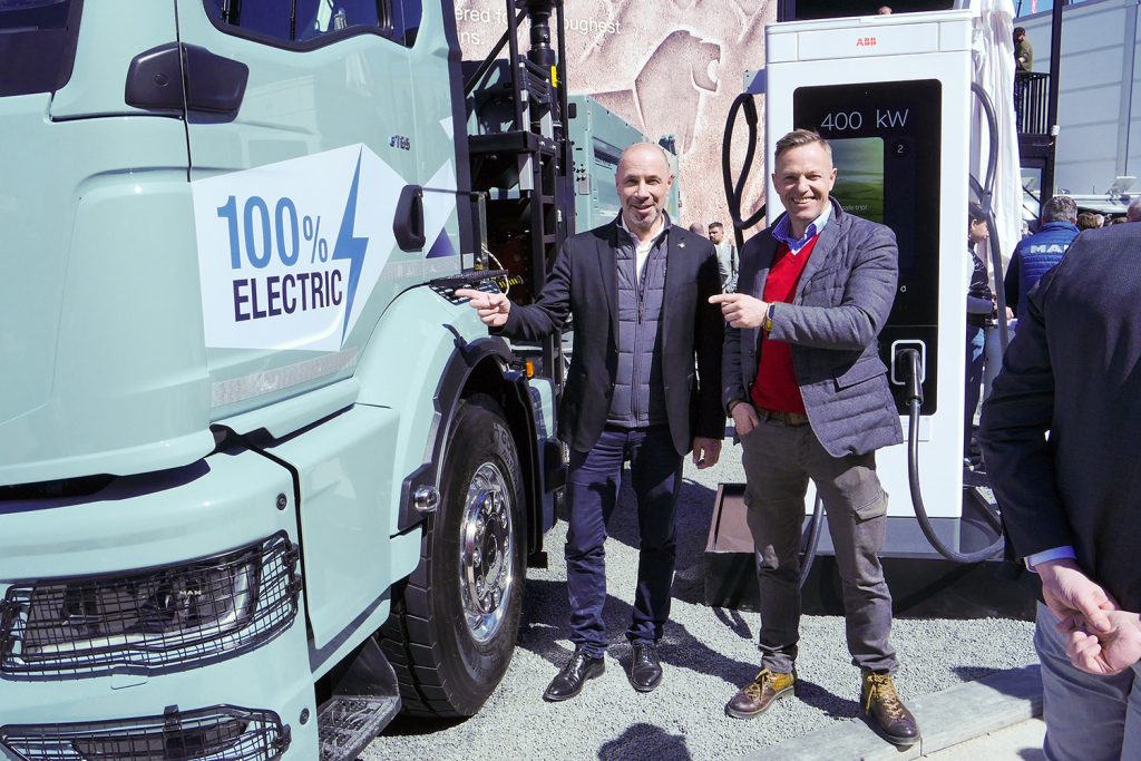 Macierzysty zakład MAN przestawia się na produkcję ciężarówek elektrycznych, która ruszy w maju br. (i wkrótce podzieli się tą specjalnością z Niepołomicami). Jego dziełem jest przedseryjny eTGS zabudowany wywrotką Meiller Trigenius i żurawiem Palfinger. To nie jest nowość, widzieliśmy go już na ubiegłorocznej wystawie IAA, ale podczas Baumy nastąpiło wydarzenie ważne dla programu „elektryfikacji” w MAN: 11 kwietnia oficjalnie otwarto zakład w Norymberdze kompletujący moduły wysokonapięciowe i budujący z nich pakiety akumulatorów, wraz systemem zarządzania, które będą montowane w elektrycznych autobusach i ciężarówkach niemieckiej marki. Stosowane ogniwa litowo-jonowe dostarcza CATL z gigafabryki w Erfurcie. Nakłady, początkowo szacowane na 100 mln euro, w rzeczywistości przekroczą 250 mln, z czego niewielką część dołożyły rządy Bawarii i Niemiec.