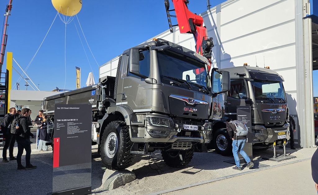 MAN zaprezentował także dwa klasyczne pojazdy z napędem na wszystkie koła. Pierwszym z nich był TGM 18.320 4×4 o DMC 18 ton wyposażony w wywrotkę trójstronną marki Ressenig. Dzięki pojedynczym kołom na obu osiach pojazd cechuje się bardzo dużą zwrotnością i sprawnie porusza się zarówno po dobrych drogach, jak i pokrytych śniegiem, czy w terenie. Dlatego można takie często spotkać zimą, wyposażone w pług na czołownicy i posypywarkę na skrzyni, a w innych porach roku rozbudowana hydraulika służy do prac utrzymaniowych. Wąska, krótka kabina CC oferuje kierowcy komfortowe stanowisko pracy.