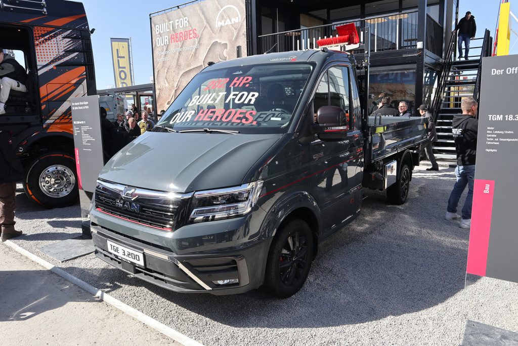 MAN TGE w ub. roku przeszedł gruntowną modernizację i ma teraz dodatkowe systemy bezpieczeństwa oraz asystujące, duży ekran dotykowy w kabinie i wiele innych udogodnień dla kierowcy, m.in. bezkluczykowy system uruchamiania silnika oraz wielofunkcyjną kierownicę. Prezentowana na targach Bauma wywrotka na podwoziu TGE 3.200 4×4 o DMC 3,5 ton demonstrowała możliwości producenta co do fabrycznego spełnienia indywidualnych życzeń klientów. „Polski akcent” jest tu podwójny, ponieważ podwozie 4×4 powstało w zakładzie wrzesińskim, po czym przejechało na drugą stronę Poznania do Sadów, gdzie znajduje się MAN Van Modification Center. Tam otrzymało m.in.: zmienione sterowanie silnikiem zwiększające moc do 205 KM, solidną osłonę podwozia, pneumatyczne zawieszenie tylnej osi, pakiet stylizacji Lion S obejmujący elementy zewnętrzne i wnętrze kabiny, a przede wszystkim lekką wywrotkę trójstronną Meiller. To jest przykład kompleksowego wyposażenia na zamówienie flot, które chcą mieć jedną fakturę i zapewnioną pełną odpowiedzialność producenta pojazdu za wszelkie zmiany.
