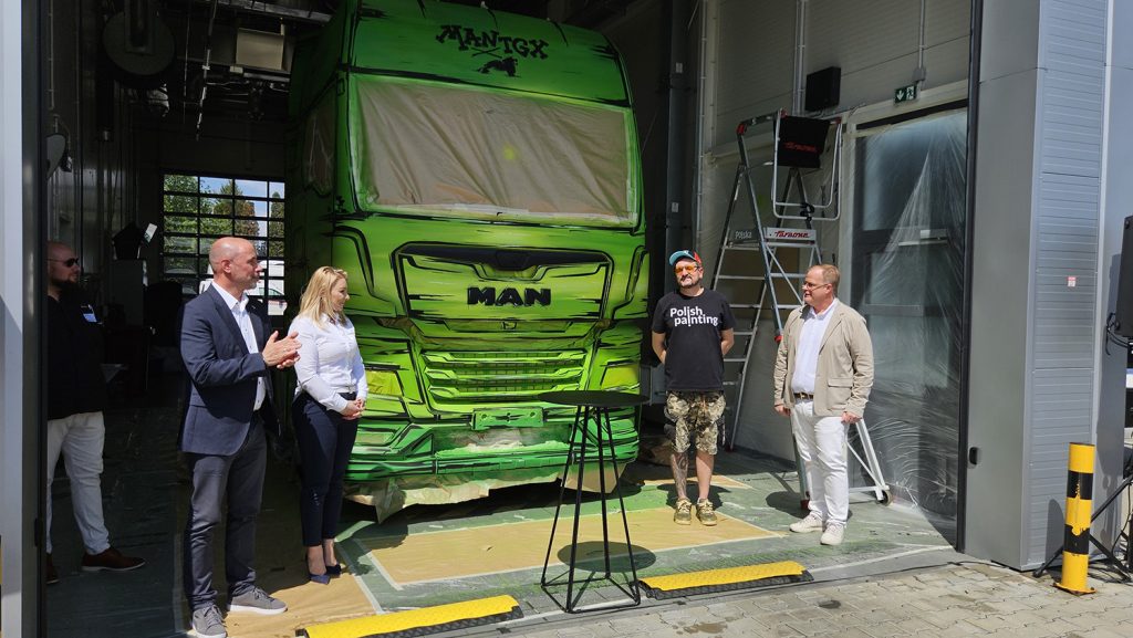 Jeden z używanych ciągników TGX uzyskał w czasie Dni Otwartych specjalne malowanie wg projektu i wykonania artysty-graficiarza znanego jako Franek Mysza, który pręży się przy swym dziele. Dyrektor Top Used Andre Baerje (z prawej) ocenia uważnie, czy aby nie przesadził, Claus Wallenstein (dyrektor zarządzający MAN Truck & Bus Polska) i Beata Jaroń (MAN Financial Services Polska) są pełni dumy.